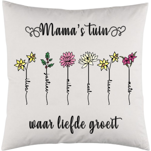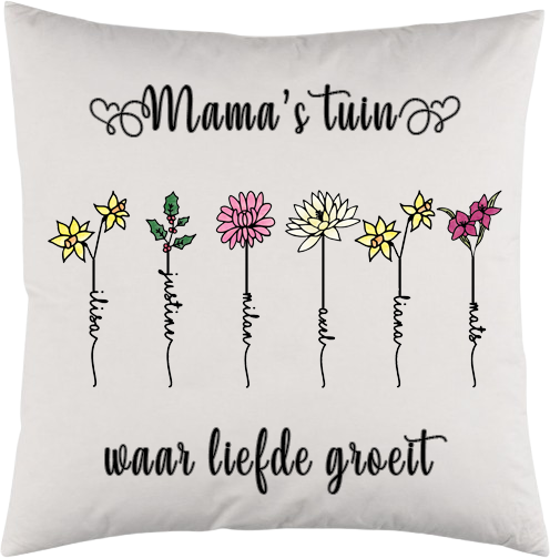 Gepersonaliseerd kussen (sloop + vulling) met geboortebloemen.